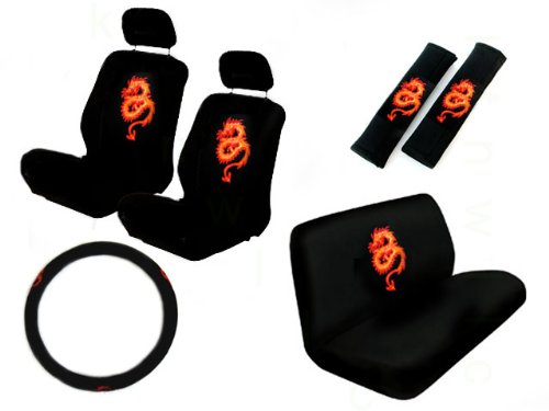 11 Piece Auto Interior Gift Set - Dragon Red - 2 Bottom Seat Covers, 2 Top Seat Covers, 2 Headrest Covers, 2 Seat Belt Shoulder Pads, 1 Steering Wheel Cover, 1 Bottom Bench Seat Cover, 1 Top Bench Seat Cover