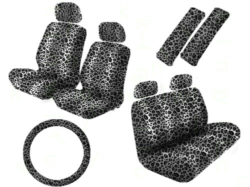 13 Piece Safari Animal Print Automotive Interior Gift Set - 2 Low Back Front Bucket Seat Covers with Separate Headrest Cover, 1 Steering Wheel Cover, 2 Shoulder Harness Pressure Relief Cover, 1 Bench Cover and 2 Rear Headrest Covers - Snow Leopard